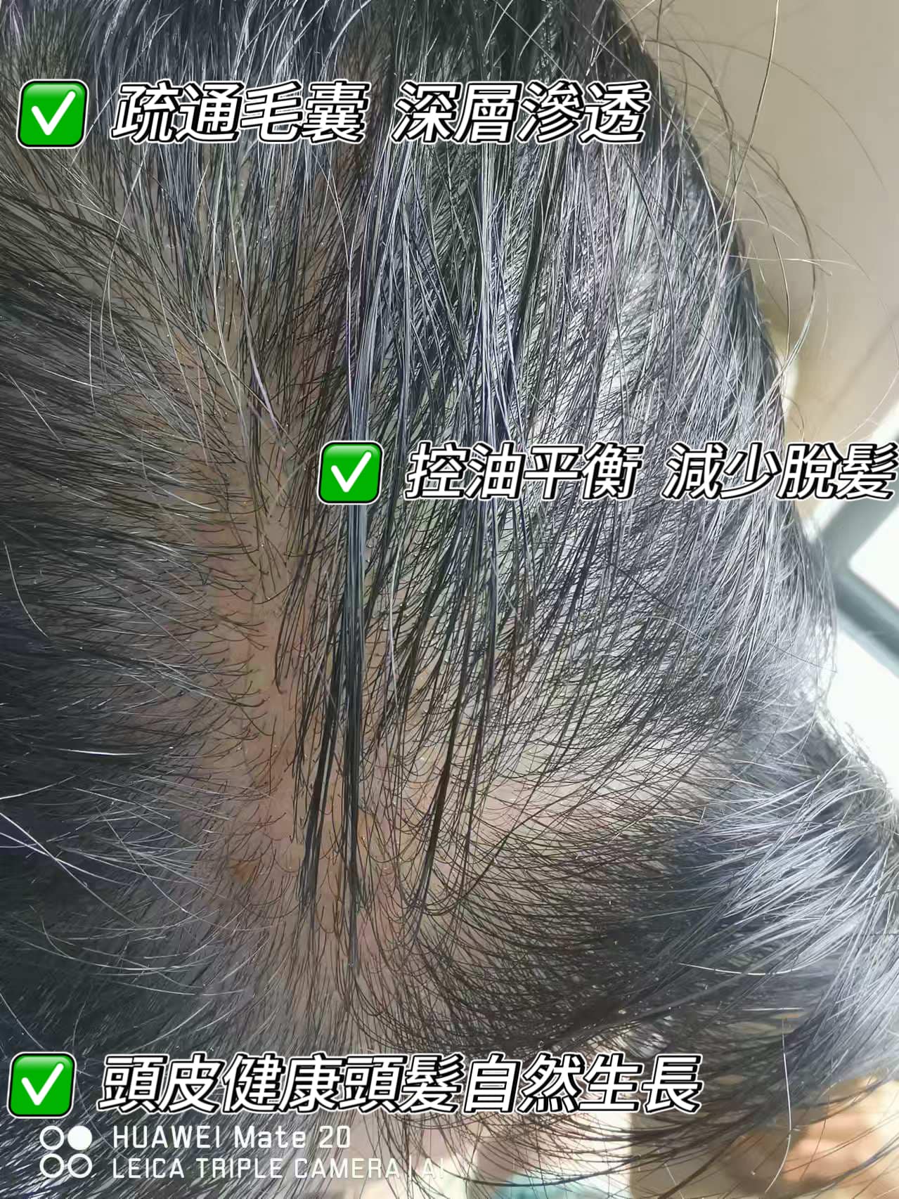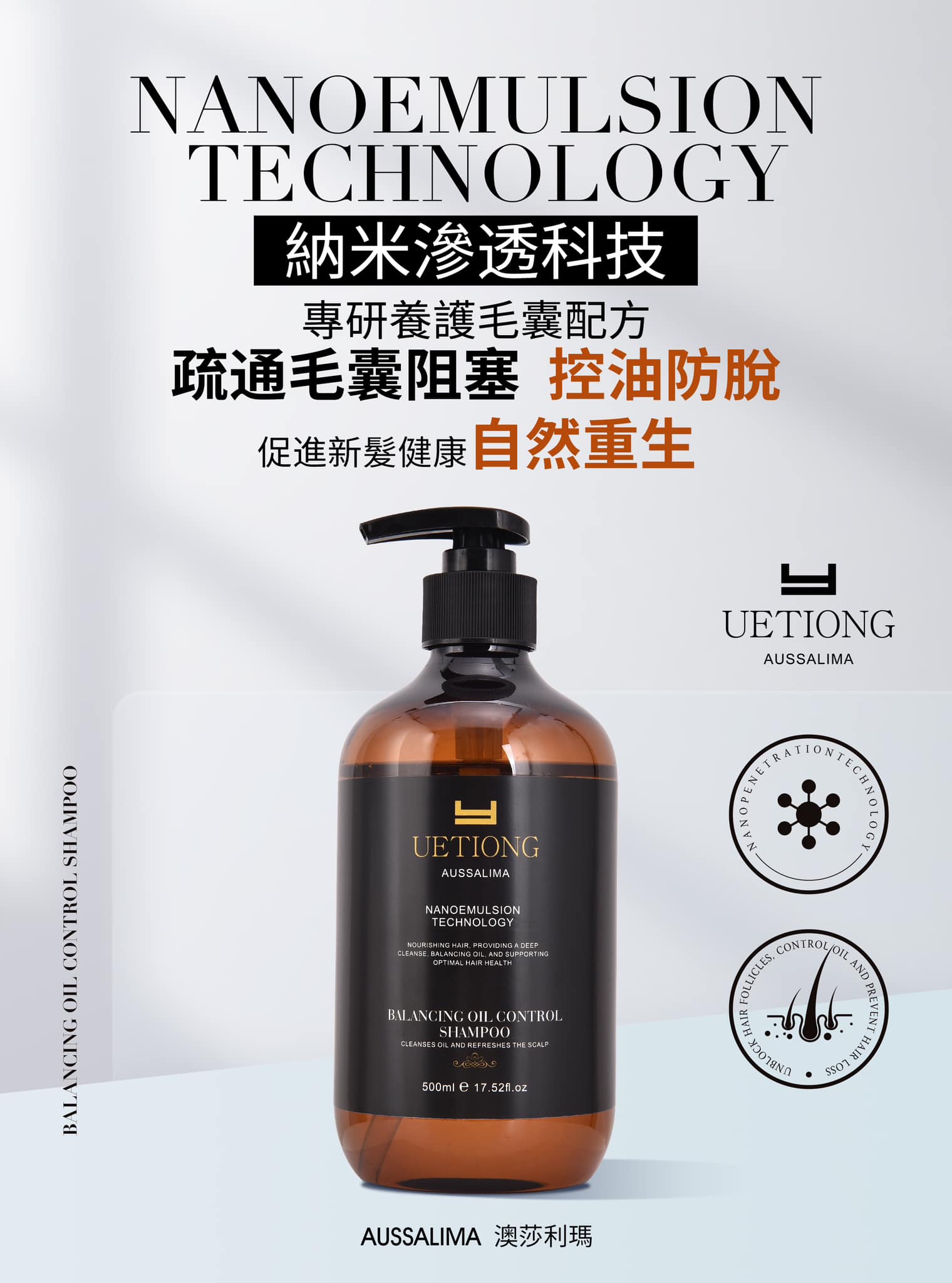 傳統洗髮水: 僅能清潔表面油脂,分子太大無法進入毛囊,營養無法有效吸收,治標不治本。